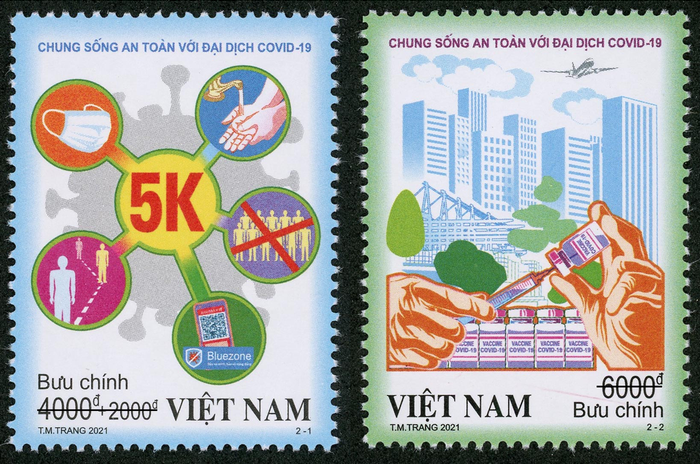 Bộ tem Chung sống an toàn với đại dịch Covid-19 phát hành năm 2021 có giá phụ thu 2.000 đồng. |