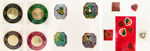 Một số mẫu tem lạ: Tem hình tròn chất liệu kim loại mạ vàng của bưu chính Tongo. Tem 8 cạnh không đều giới thiệu các loài nhện của bưu chính Papua New Guinea. Tem hình trái tim của bưu chính Pháp. |