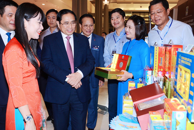 Thủ tướng Phạm Minh Chính thăm gian hàng Yến sào Khánh Hòa tại lễ công bố thương hiệu quốc gia. |