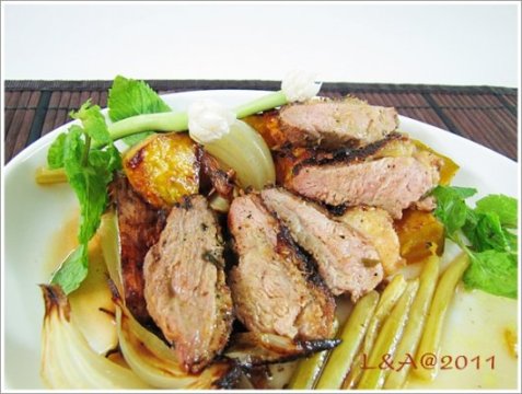 Khi thịt chín, thái thành miếng mỏng xếp ra đĩa cùng củ quả nướng chín. Dội xốt trong củ quả lên những miếng thịt và thưởng thức thôi.