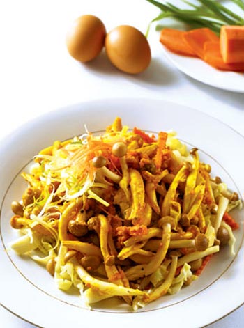 Nấm kim châm rửa sạch, để ráo. Bông cải, bắp cải, cà rốt cắt miếng vừa, chần qua nước sôi, để ráo. Trứng gà luộc chín, lột vỏ, bằm nhuyễn.