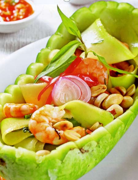 - Trộn đều bầu, cà rốt, tôm với 2 thìa xúp nước mắm gỏi sau đó cho húng lủi, rau răm, ớt, đậu phộng vào trộn nhẹ tay. Phần nước mắm còn lại cho tỏi và ớt băm vào để chấm kèm.