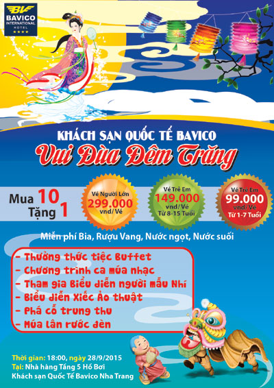 Vào lúc 18 giờ, tối 26-9 (14 tháng 8 Âm lịch), Khách sạn Quốc Tế Bavico Nha Trang sẽ tổ chức chương trình "Vui đùa đêm trăng" tại không gian ngoài trời bên hồ bơi tại tầng 5 của khách sạn...