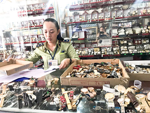 Lực lượng quản lý thị trường tỉnh phát hiện và tạm giữ đồng hồ có dấu hiệu làm nhái các thương hiệu nổi tiếng tại một cửa hàng kinh doanh đồng hồ ở Nha Trang giữa tháng 3. |