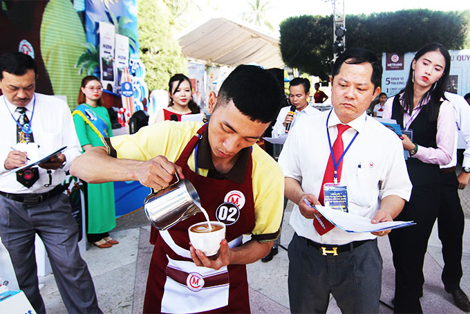 Thí sinh tập trung pha chế ly Capuchino trước sự quan sát của Ban giám khảo. |