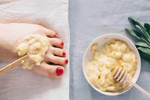 Bạn chỉ cần nghiền nát 1/2 quả chuối trong một bát nhỏ và thêm 1/2 thìa cà phê mật ong vào, trộn đều. Thoa đều hỗn hợp lên bàn chân và dùng màng bọc thực phẩm bọc lại. Giữ hỗn hợp chuối trong 15 phút, sau đó rửa sạch bằng nước ấm. Nếu có vết chai sần, bạn có thể tẩy tế bào chết bằng đá bọt. Sau đó thoa một ít kem dưỡng ẩm. Mặt nạ chuối sẽ giúp bạn khác phục được tình trạng da chân khô.