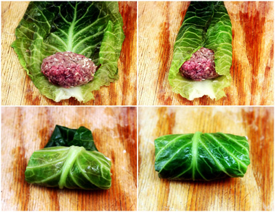 - Đặt 1 viên thịt gần cuối một lá bắp cải. Bắt đầu cuộn lên, gấp hai đầu hai bên và cuộn bắp cải như làm nem. Làm tương tự cho hết 16 chiếc bắp cải cuộn.