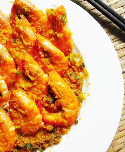 - Cho ít dầu ăn vào chảo phi thơm hành, cho lòng đỏ trứng muối vào, nêm nếm chút muối, bột ngọt, đường, tiêu. Đến khi trứng phồng lên thì cho tôm vào đảo đều để tôm áo đều trứng muối.