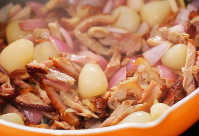 Bước 3: Sau đó cho vịt quay vào, đảo trong 2 - 5 phút. Thêm rượu nấu ăn, nước luộc gà, muối, đường, hạt tiêu vừa đủ. Đảo đều.