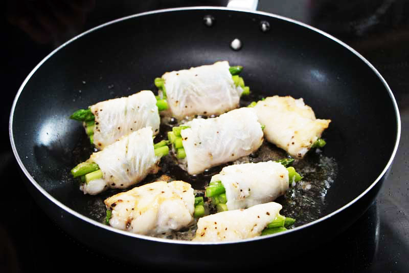 Lấy từng miếng phi lê cá cuộn 4-5 thanh măng tây ở giữa, dùng tăm ghim lại.