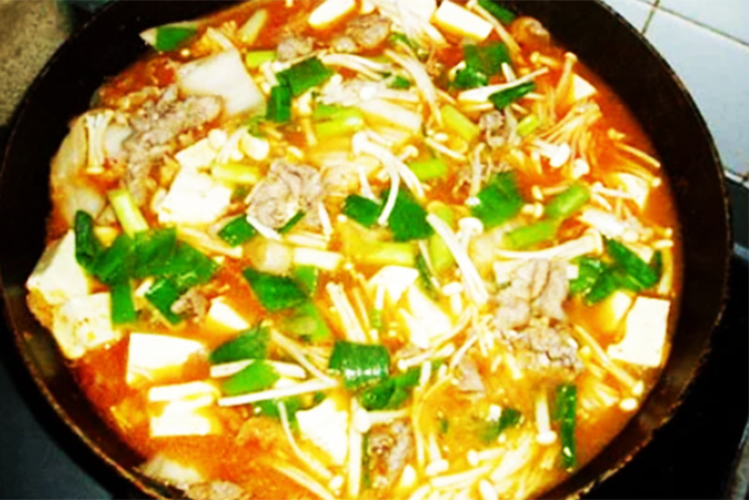 - Đổ dầu ăn vào nồi, cho cà chua vào xào qua, đổ nước vào đun sôi. Thả đậu hũ, thịt vào sau đó là giá đỗ, đun lửa to, cho nồi canh sôi trở lại.
