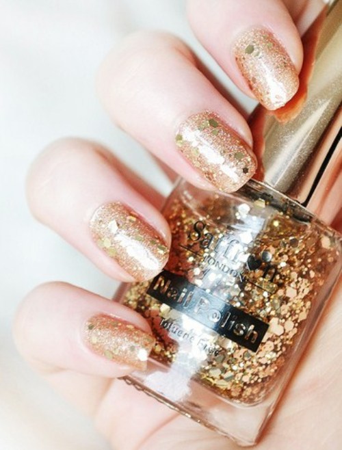 Sắc tươi sáng và thanh lịch của màu vàng nhũ sẽ giúp bạn thật nổi bật tại các buổi dạ tiệc mùa Đông. Bạn có thể chỉ thoa sơn màu vàng cho ngày thường, đi làm hoặc đi chơi đơn giản. Màu vàng nhũ có thể dễ dàng kết hợp với những bộ cánh sẫm màu như đen, xanh navy hay tím.