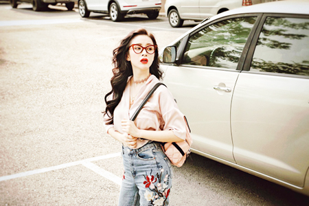 Một người sành mốt như Thanh Hằng chẳng thể nào thiếu món đồ đang tạo “bão” như quần jeans thêu. Cô kết hợp tinh giản với áo phông trắng phóng khoáng trên phố.