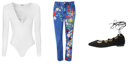 Bạn nên chọn áo trơn, đơn sắc khi mặc quần jeans thêu để không bị rối mắt.