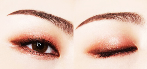 Ngoài việc tán đều phấn mắt lên mí mắt trên, bạn còn có thể dùng cọ mảnh để tạo viền màu cam đồng ở mí mắt dưới. Nếu bạn còn e ngại không muốn dùng phấn màu cam đồng cho toàn bộ mí mắt, chỉ cần dặm một chút phấn ở chính giữa mí để tạo điểm nhấn.