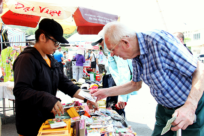 Khách du lịch tàu biển xem hàng lưu niệm tại cảng Nha Trang. |