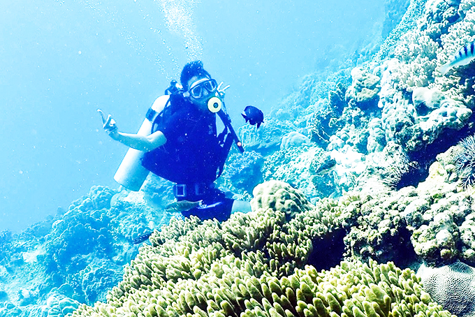 Khoác lên mình bộ đồ lặn chuyên dụng, cùng một bình thở oxy sau lưng, anh Quyền - thợ lặn của một câu lạc bộ lặn hướng dẫn tôi các cách ra dấu hiệu cơ bản khi ở dưới nước. Sau khi tất cả sẵn sàng, chúng tôi cùng hòa mình vào đại dương. Thả tự do người, dần chìm xuống dưới mặt nước biển. Cảnh vật nằm ngoài trí tưởng tượng của tôi, thế giới trên mặt nước của nắng vàng, cát trắng biến mất, nhường lại cho một thủy cung sống động, con người như bị biến thành tí hon giữa muôn trùng loài cá, hàng trăm loài san hô đang vây quanh. Ở độ sâu khoảng 4m, nắng vẫn có thể xuyên qua làn nước, chiếu rõ những rặng san hô nhiều màu sắc đang lay động chào đón người ghé thăm. Nước ở Hòn Mun rất trong, dễ dàng thấy được nhiều đàn cá đang bơi lội từ khoảng cách khá xa, chúng dường như cũng không e ngại với việc có mặt của con người, thản nhiên bơi lướt qua chúng tôi. Chỉ việc lấy một mẩu vụn nhỏ bánh mì chuẩn bị sẵn và đưa ra, hàng chục con cá sẵn sàng vây quanh chúng tôi để được thưởng thức chút quà ngon.