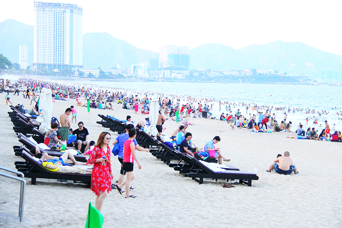 Bãi biển Nha Trang chật kín khách dịp lễ 30-4 năm 2019. |
