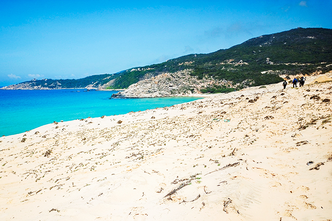 Các phượt thủ phải băng qua những đồi cát, lối mòn để đi tới khu vực danh thắng Mũi Đôi - Hòn Đầu. |