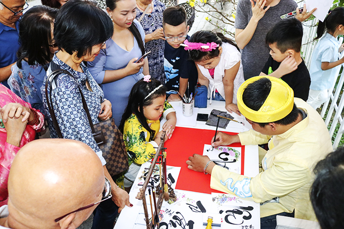 Viết chữ thư pháp đầu xuân ở Khu du lịch Champa Island Nha Trang. |
