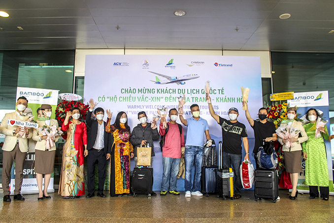 Chiều 25-11, Sở Du lịch Khánh Hòa chủ trì phối hợp với Cảng Hàng không quốc tế Cam Ranh, Công ty cổ phần Nhà ga quốc tế Cam Ranh, Hãng hàng không Bamboo Airways và Vietravel tổ chức Lễ đón đoàn khách du lịch quốc tế có "hộ chiếu vắc xin" đến Nha Trang - Khánh Hòa.