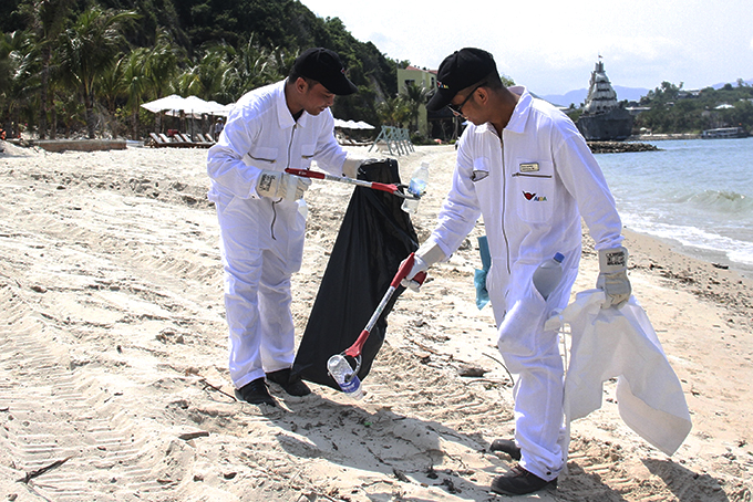 Khách du lịch nước ngoài nhặt rác tại biển Nha Trang. |