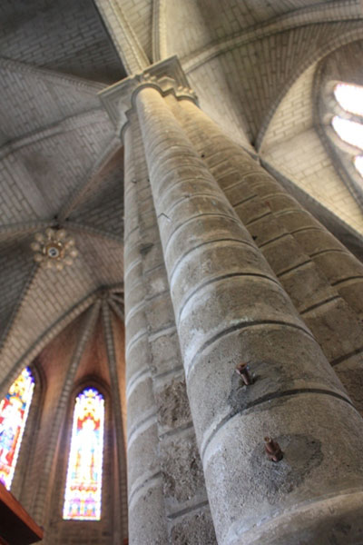 Đứng từ xa nhìn, nhiều người vẫn lầm tưởng công trình kiến trúc đồ sộ này được xây dựng bằng đá chẻ, nhưng thực tế đá chẻ chỉ được dùng lát đường và sân. Còn toàn bộ các bức tường của nhà thờ được xây bằng táp lô xi măng. Chính linh mục Louis Vallet cùng các cộng sự đã trực tiếp đúc nên các khối táp lô này. Đặc biệt, chỉ phần mái bằng của hành lang chạy dọc hai bên được đổ bê tông cốt thép, còn toàn bộ mái vòm của nhà nguyện đều được dùng cốt tre cật và lưới thép mắt cáo.