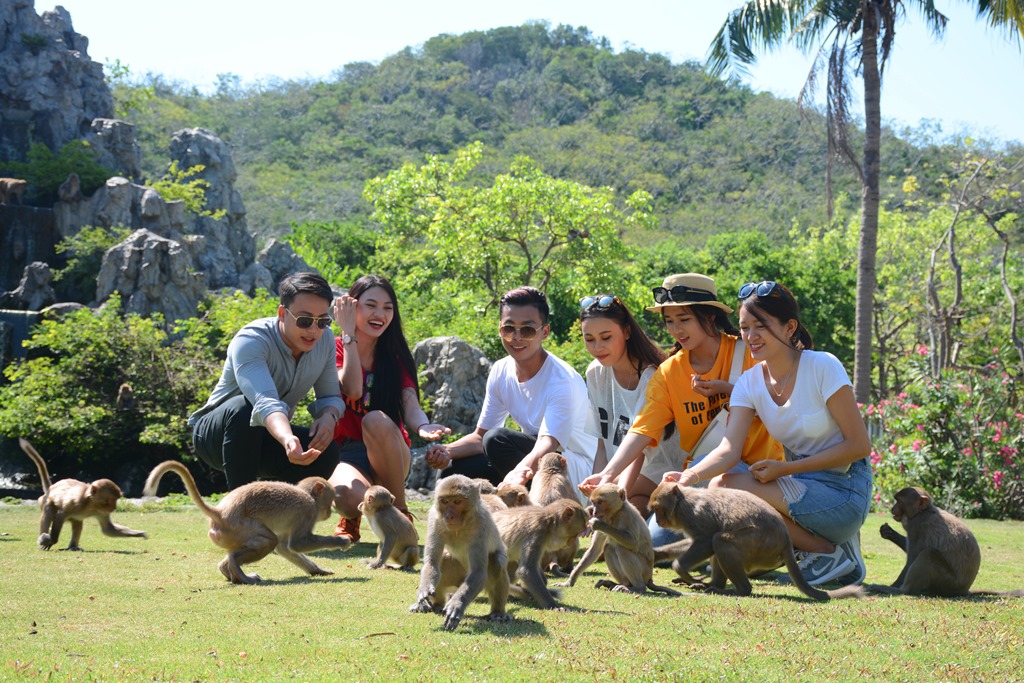 Khách du lịch vui đùa với đàn khỉ ở Khu du lịch Đảo Khỉ |