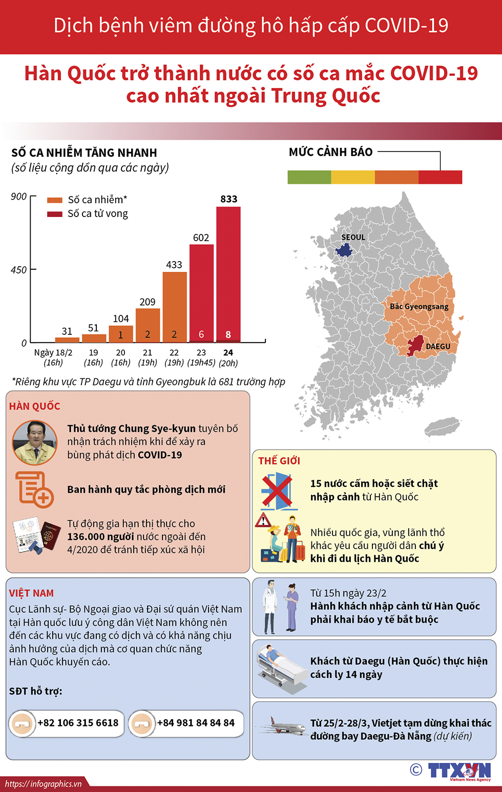 Chiều 24/2/2020, Hàn Quốc đã ghi nhận thêm 70 ca mới nhiễm virus SARS-CoV-2,nâng tổng số ca mắc COVID-19 lên 833 trường hợp. Hàn Quốc đã trở thành nước có số ca mắc COVID-19 cao nhất ngoài Trung Quốc.