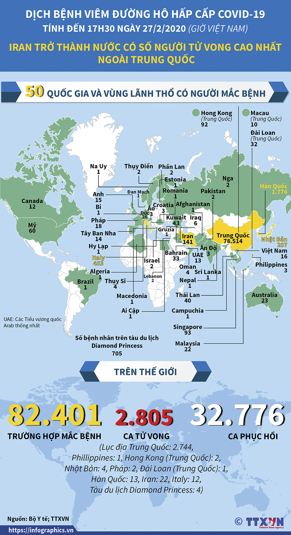 Đến 17h30 ngày 27/2/2020, đã có 82.401 ca mắc dịch bệnh viêm đường hô hấp cấp COVID-19 trên toàn thế giới và 2.805 người tử vong.