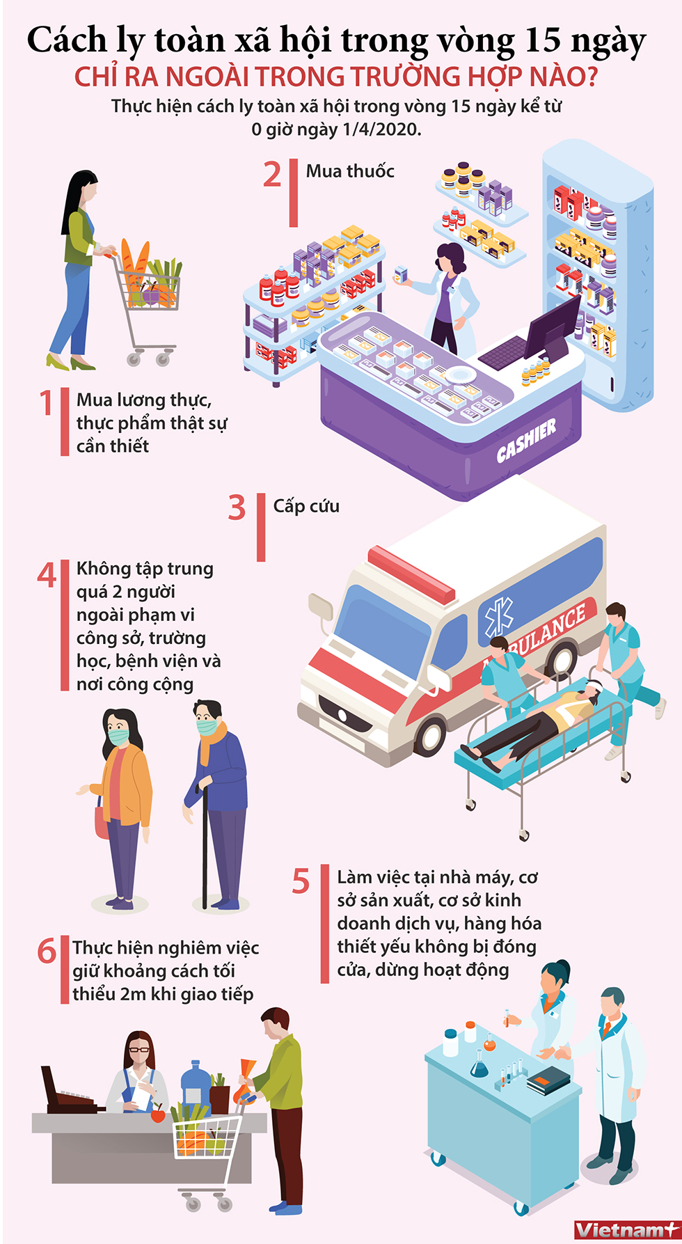 Chỉ thị 16/CT-TTg do Thủ tướng Chính phủ ban hành nêu rõ, yêu cầu mọi người dân ở tại nhà, chỉ ra ngoài trong trường hợp thật sự cần thiết như mua lương thực, thực phẩm, thuốc men, cấp cứu, làm việc tại nhà máy, cơ sở sản xuất, cơ sở kinh doanh dịch vụ, hàng hóa thiết yếu không bị đóng cửa, dừng hoạt động và các trường hợp khẩn cấp khác; thực hiện nghiêm việc giữ khoảng cách tối thiểu 2m khi giao tiếp; không tập trung quá 2 người ngoài phạm vi công sở, trường học, bệnh viện và tại nơi công cộng.