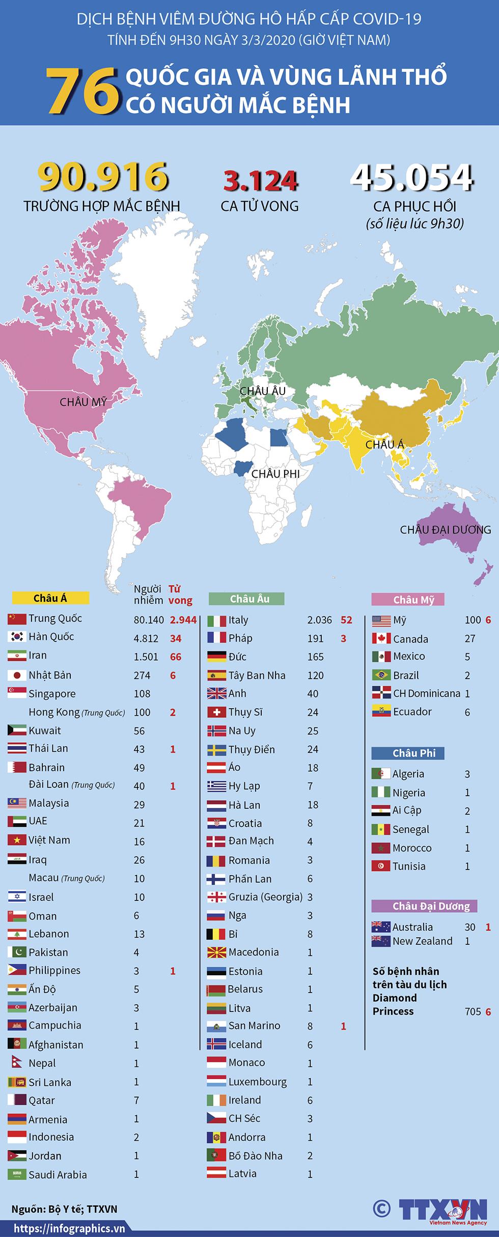 Đến 9h30 ngày 3/3/2020, đã có 90.913 ca mắc dịch bệnh viêm đường hô hấp cấp COVID-19 trên toàn thế giới và 3.123 người tử vong.