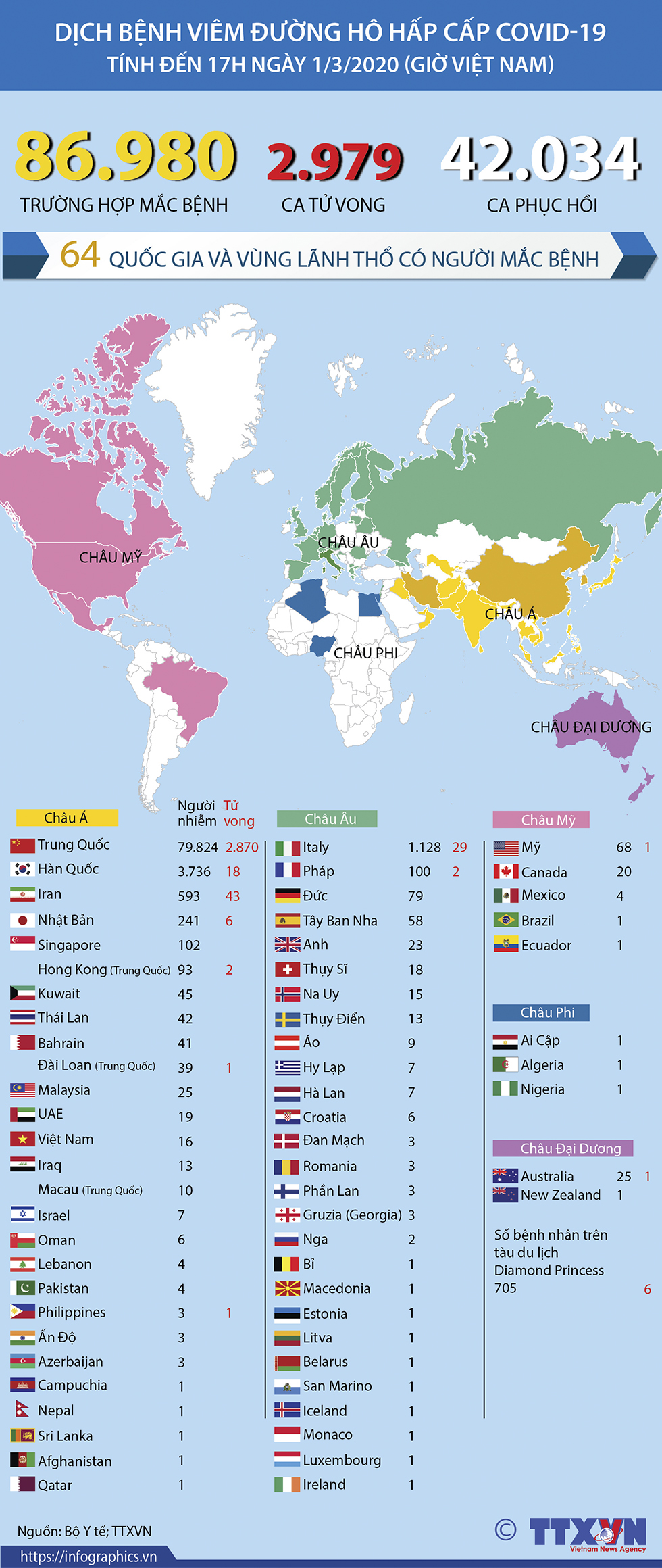 Đến 16h ngày 1/3/2020, đã có 86.980 ca mắc dịch bệnh viêm đường hô hấp cấp COVID-19 trên toàn thế giới và 2.979 người tử vong.