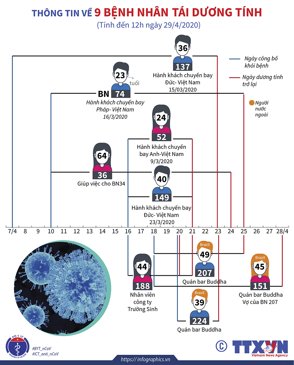 Theo tin từ Tiểu ban Điều trị Ban chỉ đạo Quốc gia phòng, chống Covid-19, tới sáng 29/4/2020, Việt Nam đã ghi nhận 9 ca tái dương tính sau khi được công bố khỏi bệnh.
