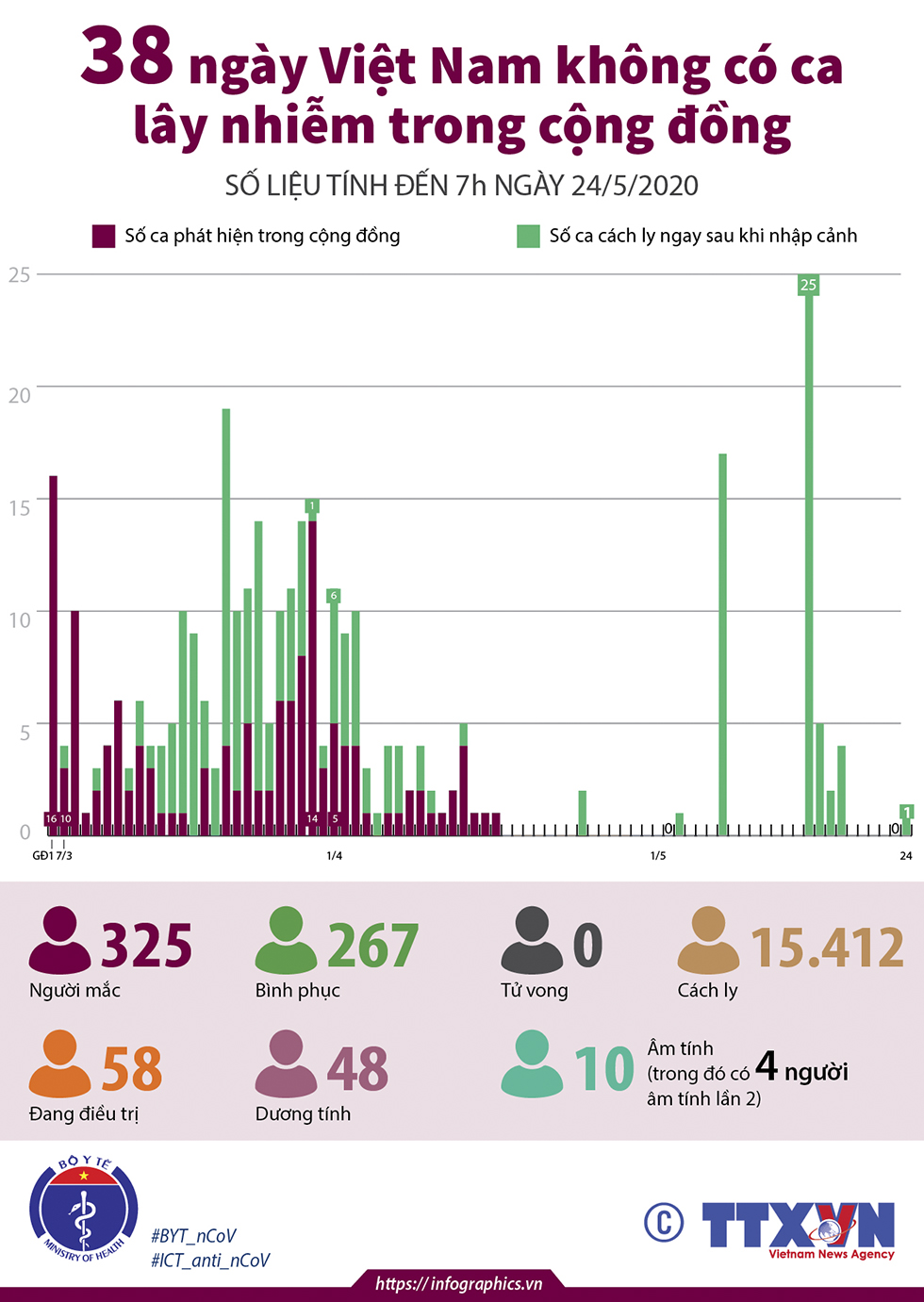 Đến 7h ngày 24/5, tổng số ca mắc COVID-19 tại Việt Nam là 325. Đã 38 ngày Việt Nam không có ca lây nhiễm trong cộng đồng.