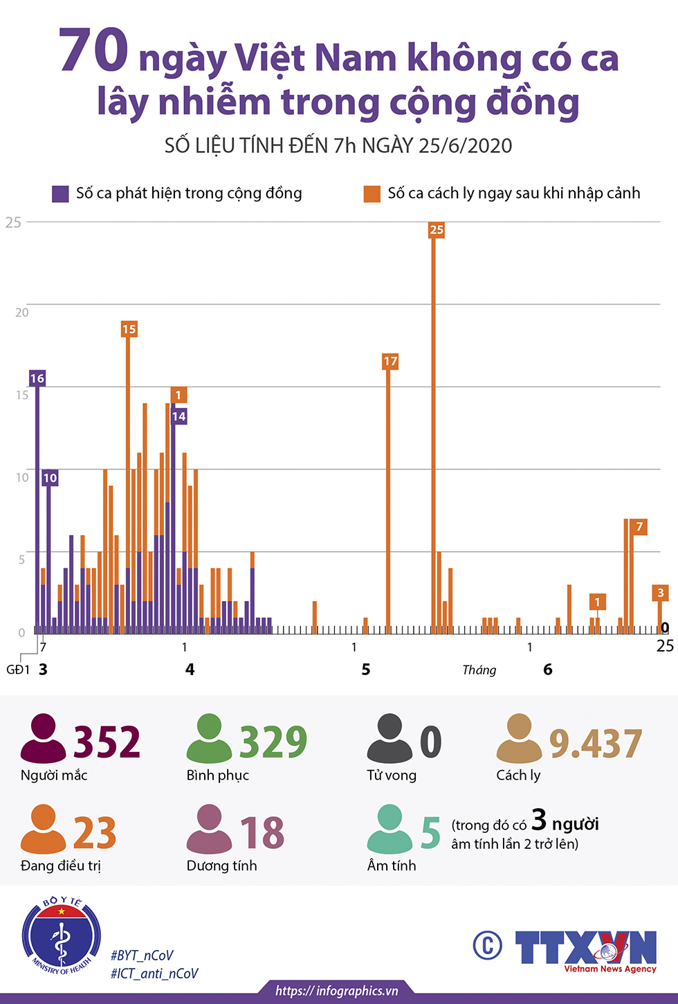 Đến 7h ngày 25/6/2020, tổng số ca mắc COVID-19 tại Việt Nam là 352. Đã 70 ngày Việt Nam không có ca lây nhiễm trong cộng đồng.