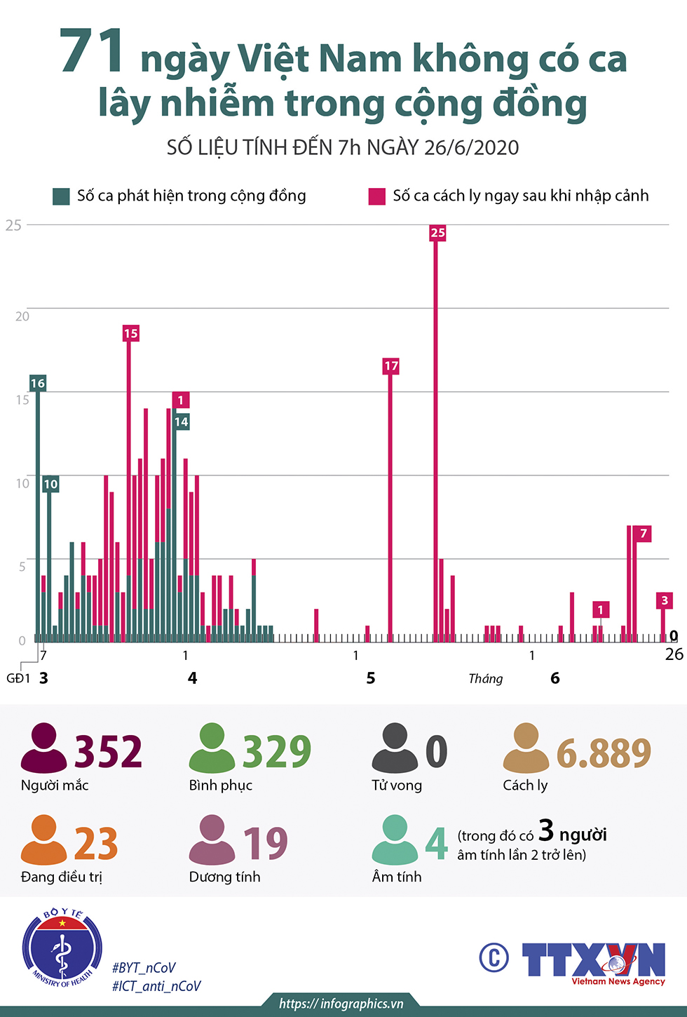 Đến 7h ngày 26/6/2020, tổng số ca mắc COVID-19 tại Việt Nam là 352. Đã 71 ngày Việt Nam không có ca lây nhiễm trong cộng đồng.