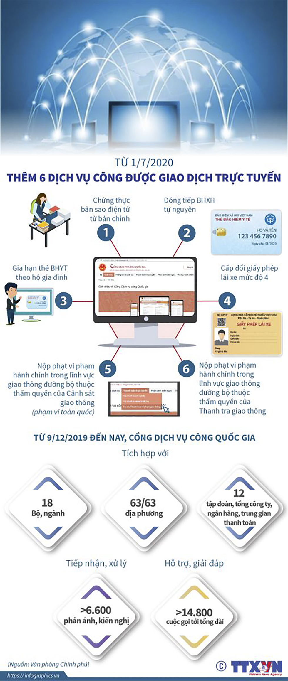 Từ ngày 1-7-2020, Cổng dịch vụ công quốc gia sẽ tích hợp thêm 6 dịch vụ công, nâng tổng số dịch vụ công được cung cấp trực tuyến tại đây lên 725.