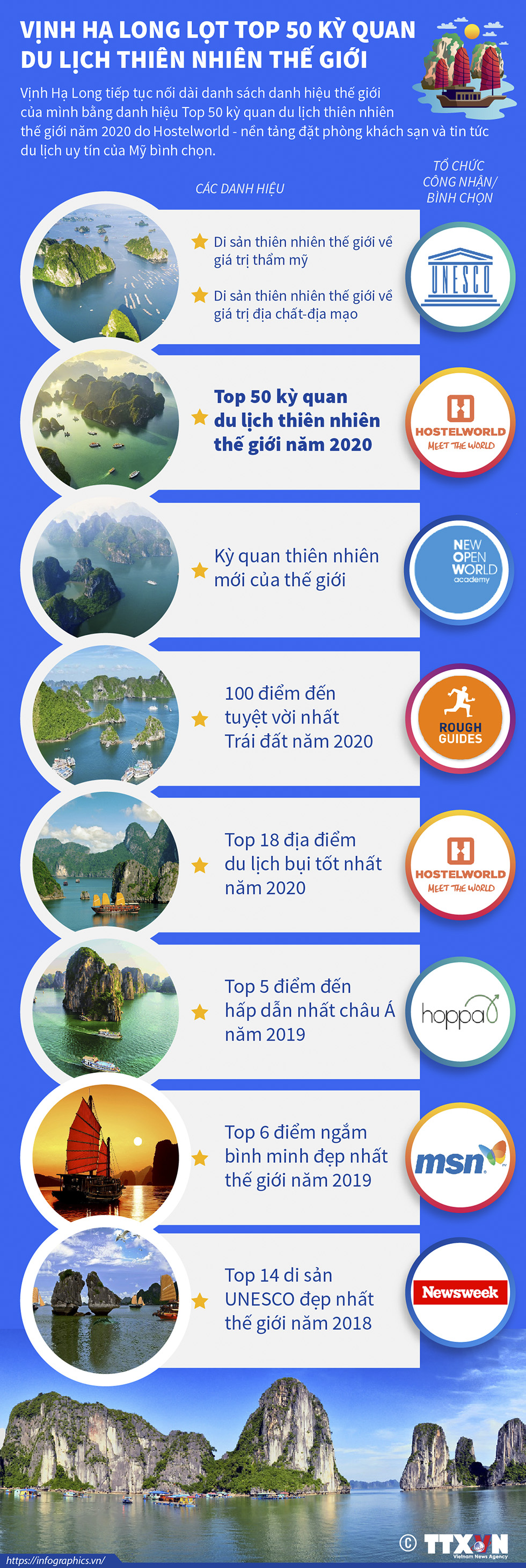 Vịnh Hạ Long tiếp tục nối dài danh sách danh hiệu thế giới của mình bằng danh hiệu Top 50 kỳ quan du lịch thiên nhiên thế giới năm 2020 do Hostelworld - nền tảng đặt phòng khách sạn và tin tức du lịch uy tín của Mỹ bình chọn.