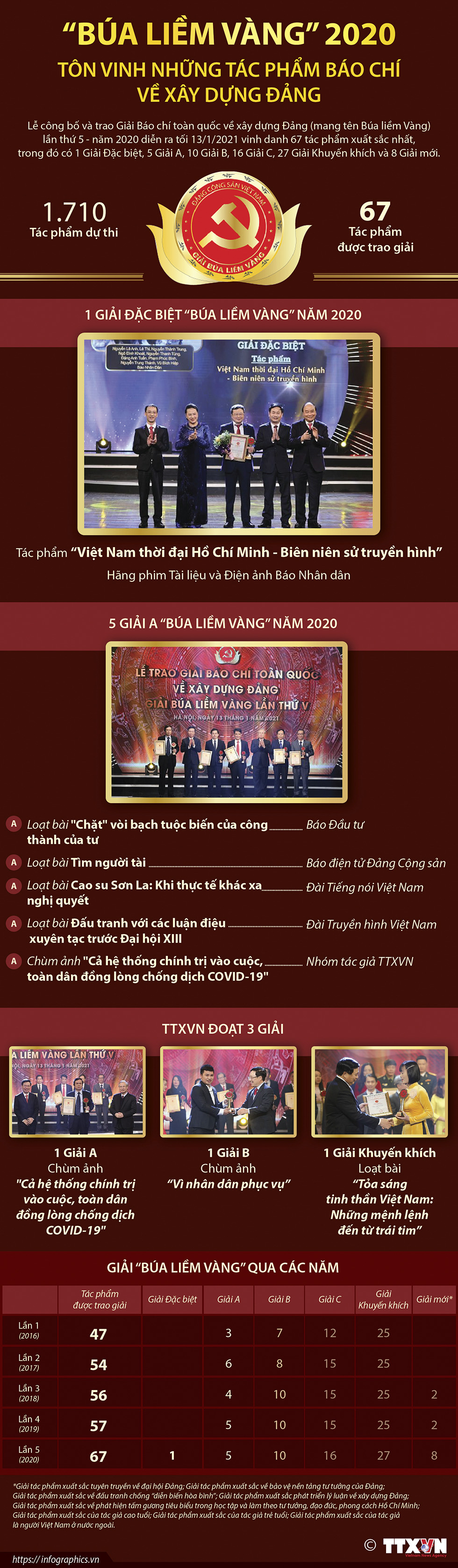 Lễ công bố và trao Giải Báo chí toàn quốc về xây dựng Đảng (mang tên Búa liềm Vàng) lần thứ 5 - năm 2020 diễn ra tối 13/1/2021 vinh danh 67 tác phẩm xuất sắc nhất, trong đó có 1 Giải Đặc biệt, 5 Giải A, 10 Giải B, 16 Giải C, 27 Giải Khuyến khích và 8 Giải mới.