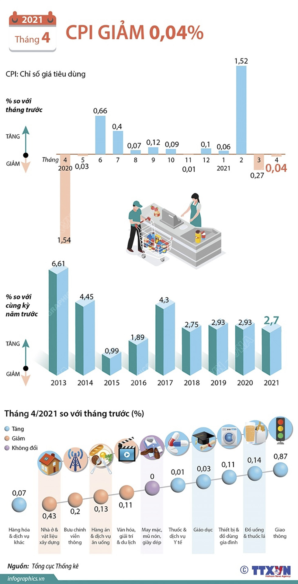 Chỉ số giá tiêu dùng (CPI) tháng 4/2021 giảm 0,04% so với tháng trước. Có 4/11 nhóm hàng hóa và dịch vụ có chỉ số giá giảm.