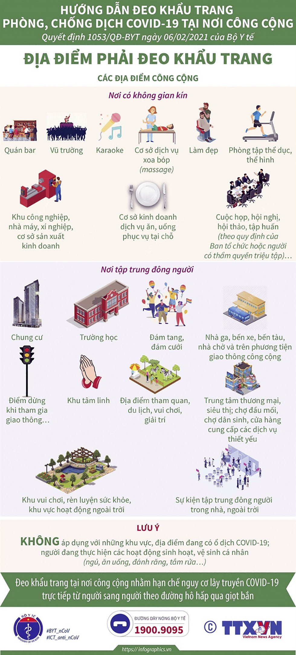 Hà Nội (TTXVN 29/4) Để phòng, chống dịch COVID-19, mọi người cần nghiêm túc thực hiện đeo khẩu trang tại nơi công cộng, đặc biệt tại những nơi có không gian kín, nơi tập trung đông người. Mục đích là nhằm hạn chế nguy cơ lây truyền COVID-19 trực tiếp từ người sang người theo đường hô hấp qua giọt bắn.