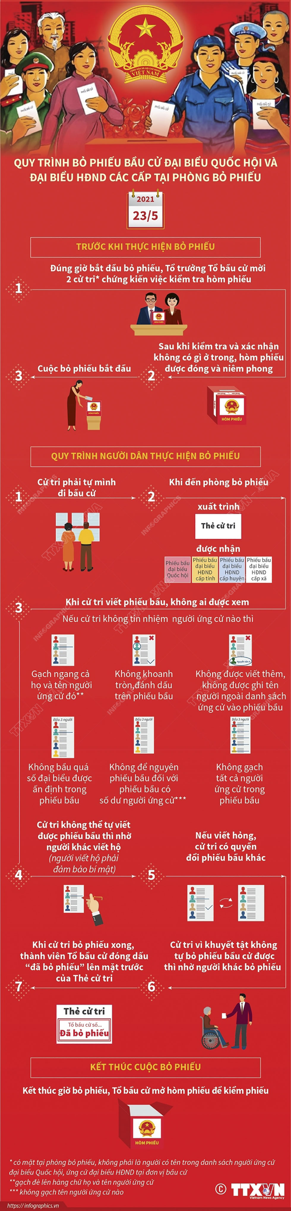 Dưới đây là quy trình bỏ phiếu bầu cử đại biểu Quốc hội khóa XV và đại biểu Hội đồng nhân dân các cấp nhiệm kỳ 2021 - 2016 tại phòng bỏ phiếu.