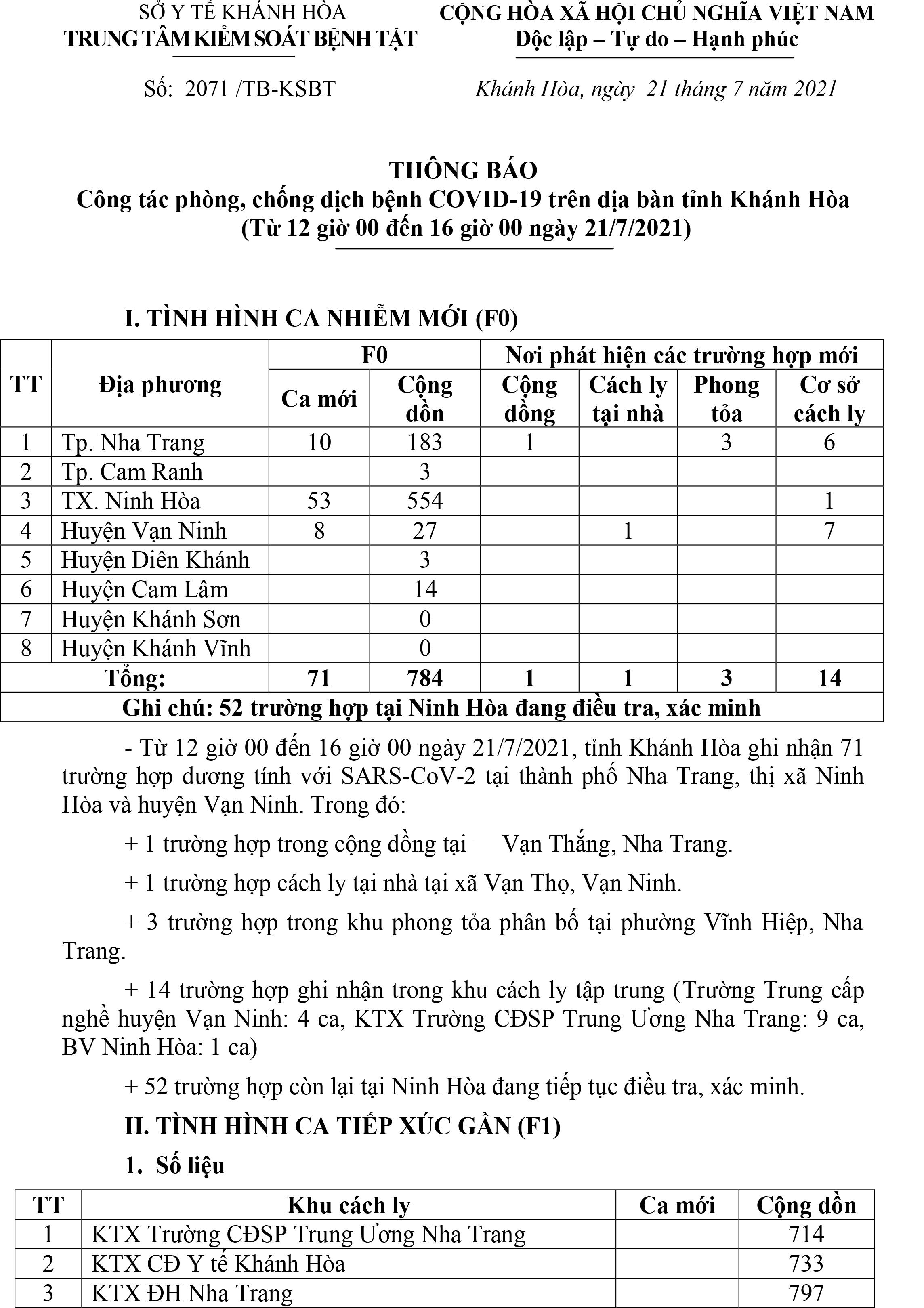 Chiều 21-7, theo Trung tâm Kiểm soát bệnh tật tỉnh Khánh Hòa, từ 12 giờ đến 16 giờ ngày 21-7, toàn tỉnh Khánh Hòa ghi nhận 71 ca dương tính mới với SARS-CoV-2.