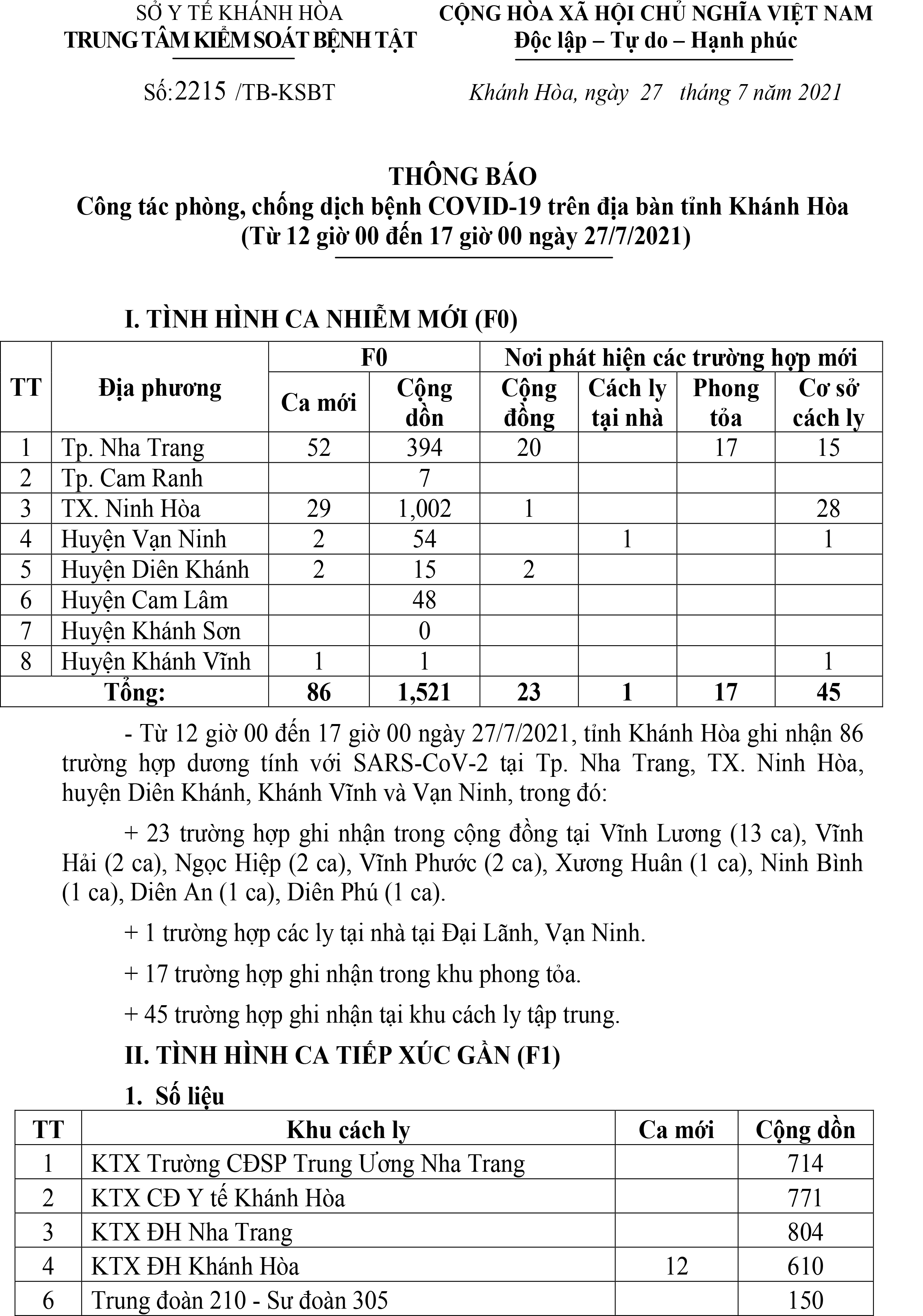 Chiều 27-7, theo Trung tâm Kiểm soát bệnh tật tỉnh Khánh Hòa, từ 12 giờ đến 16 giờ ngày 27-7, tỉnh Khánh Hòa ghi nhận 86 ca dương tính mới với SARS-CoV-2.