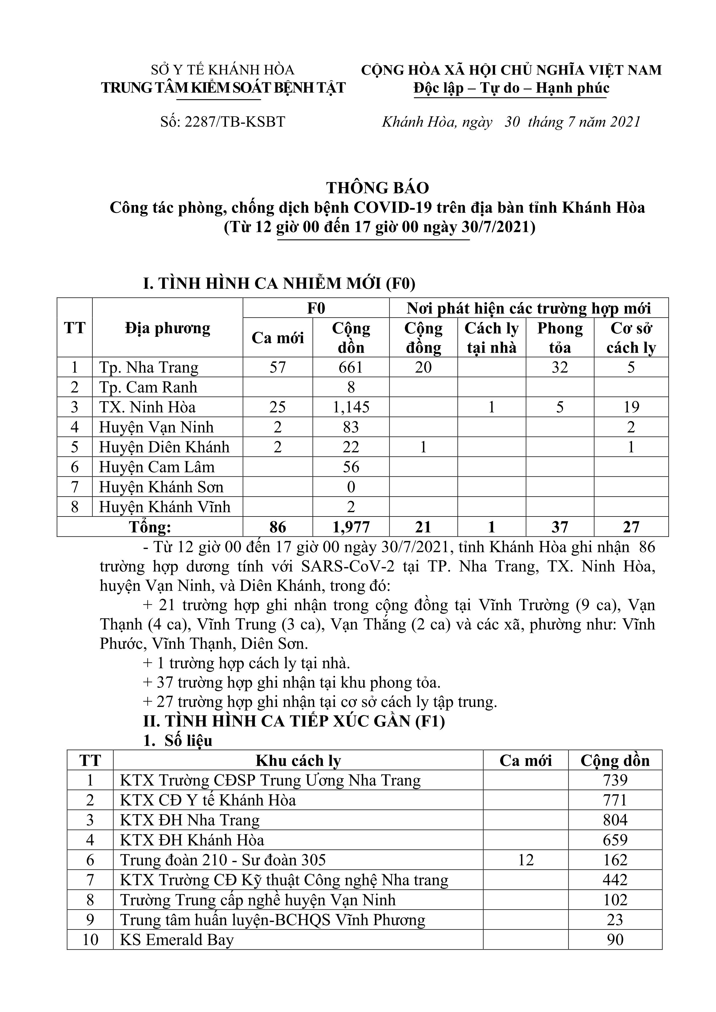 Chiều 30-7, theo Trung tâm Kiểm soát bệnh tật tỉnh Khánh Hòa từ 12 giờ đến 17 giờ ngày 30-7, toàn tỉnh ghi nhận thêm 86 trường hợp dương tính với SARS-CoV-2.