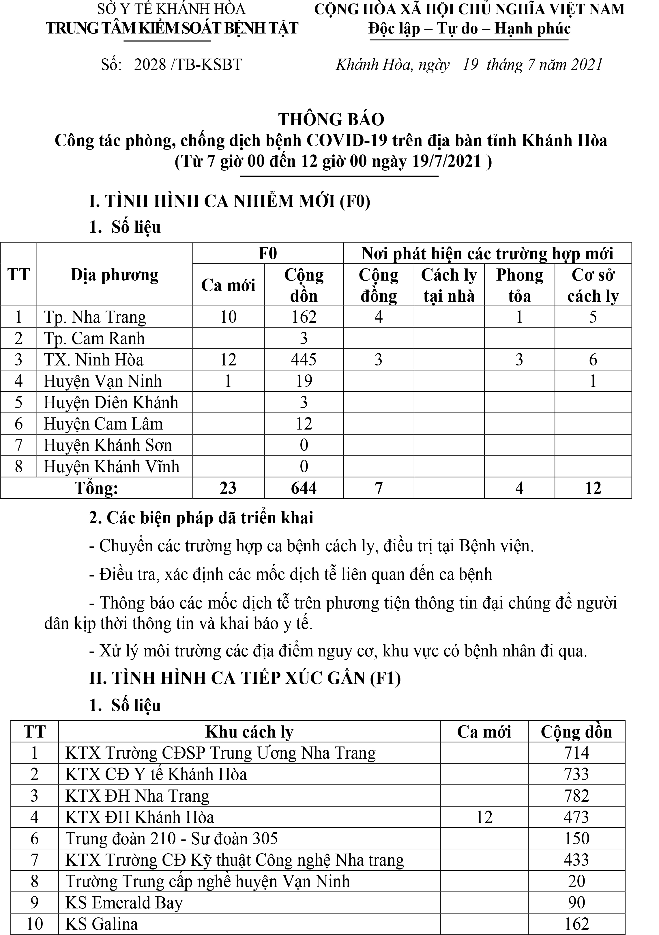Trưa 19-7, theo Trung tâm Kiểm soát bệnh tật tỉnh Khánh Hòa, từ 7 giờ đến 12 giờ ngày 19-7, toàn tỉnh Khánh Hòa ghi nhận 23 ca dương tính mới với SARS-CoV-2.