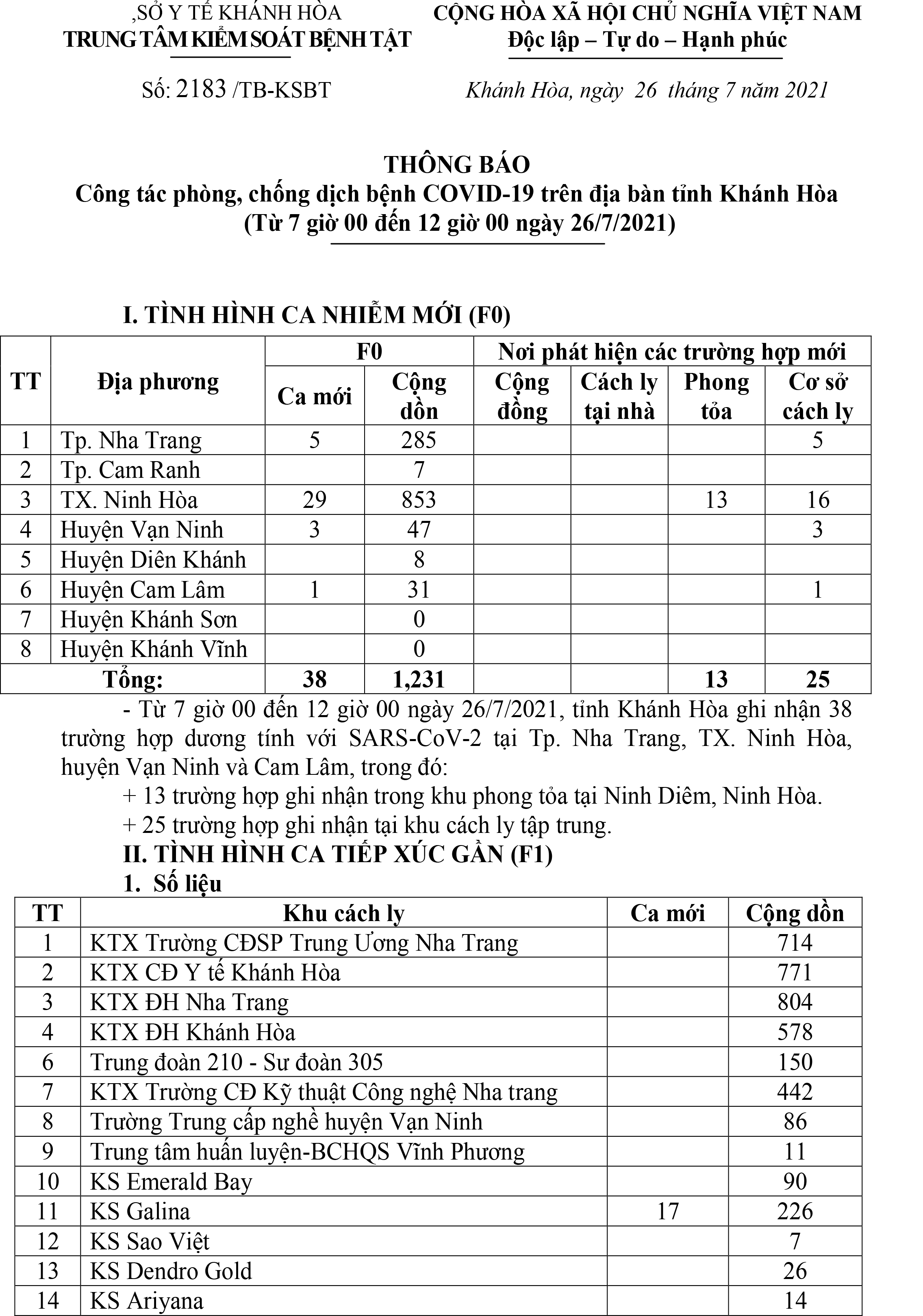 Trưa 26-7, theo Trung tâm Kiểm soát bệnh tật tỉnh Khánh Hòa, từ 7 giờ đến 12 giờ cùng ngày, toàn tỉnh ghi nhận 38 trường hợp dương tính với SARS-CoV-2.