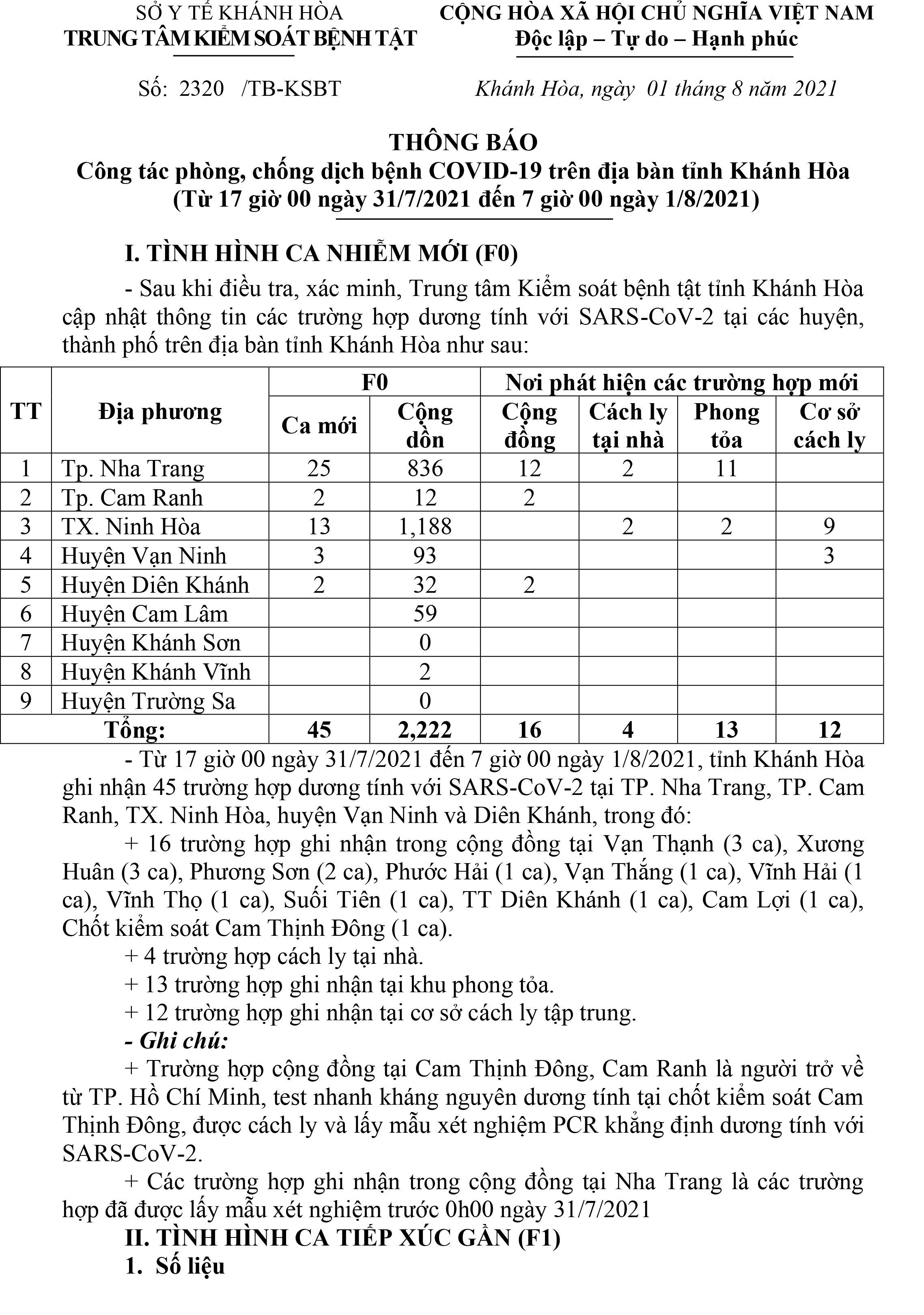 Sáng 1-8, theo Trung tâm Kiểm soát bệnh tật tỉnh Khánh Hòa từ 17 giờ ngày 31-7 đến 7 giờ ngày 1-8, toàn tỉnh ghi nhận thêm 45 trường hợp dương tính với SARS-CoV-2.