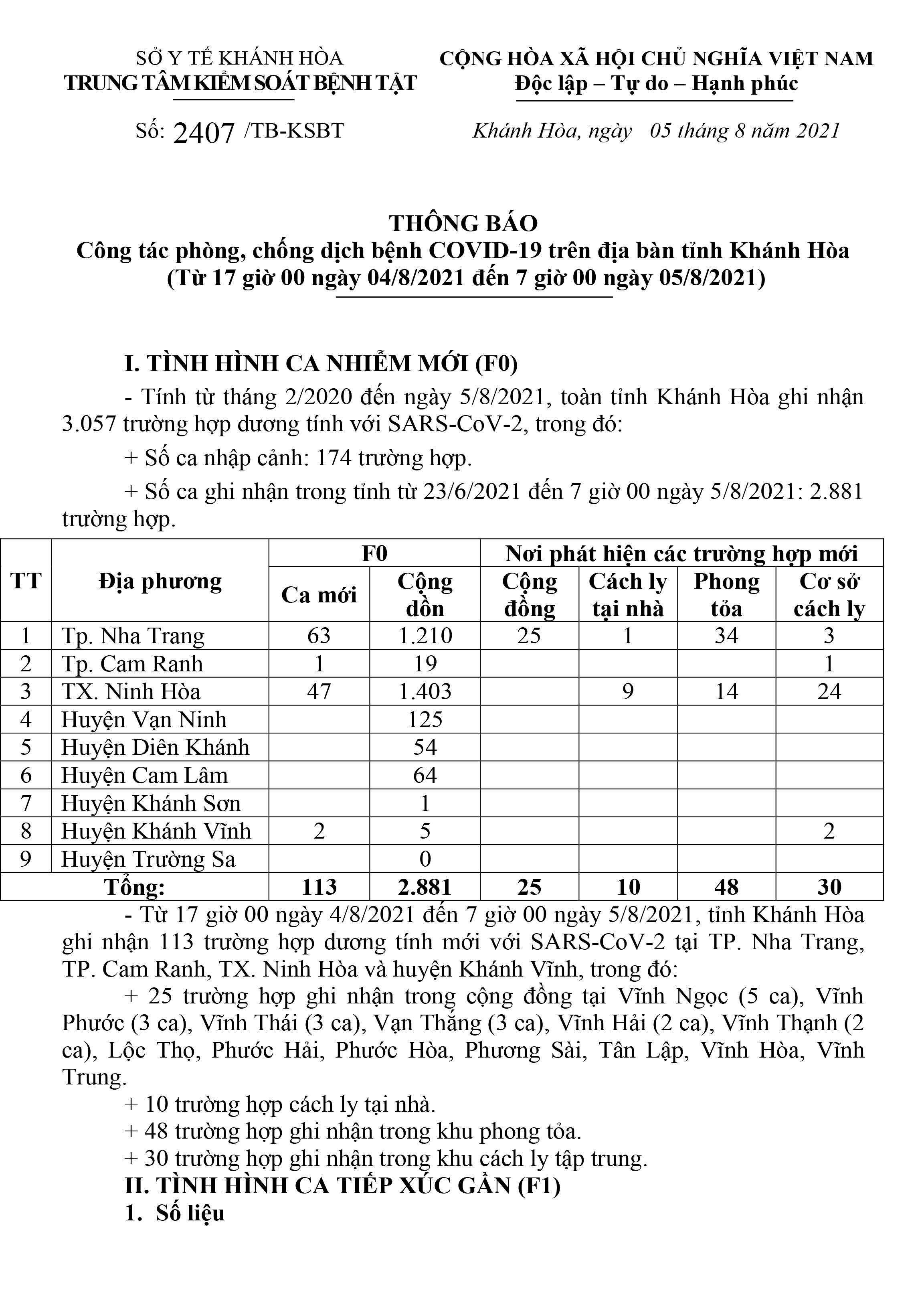 Sáng 5-8, theo Trung tâm Kiểm soát bệnh tật tỉnh Khánh Hòa từ 17 giờ ngày 4-8 đến 7 giờ ngày 5-8, toàn tỉnh ghi nhận thêm 113 trường hợp dương tính với SARS-CoV-2.